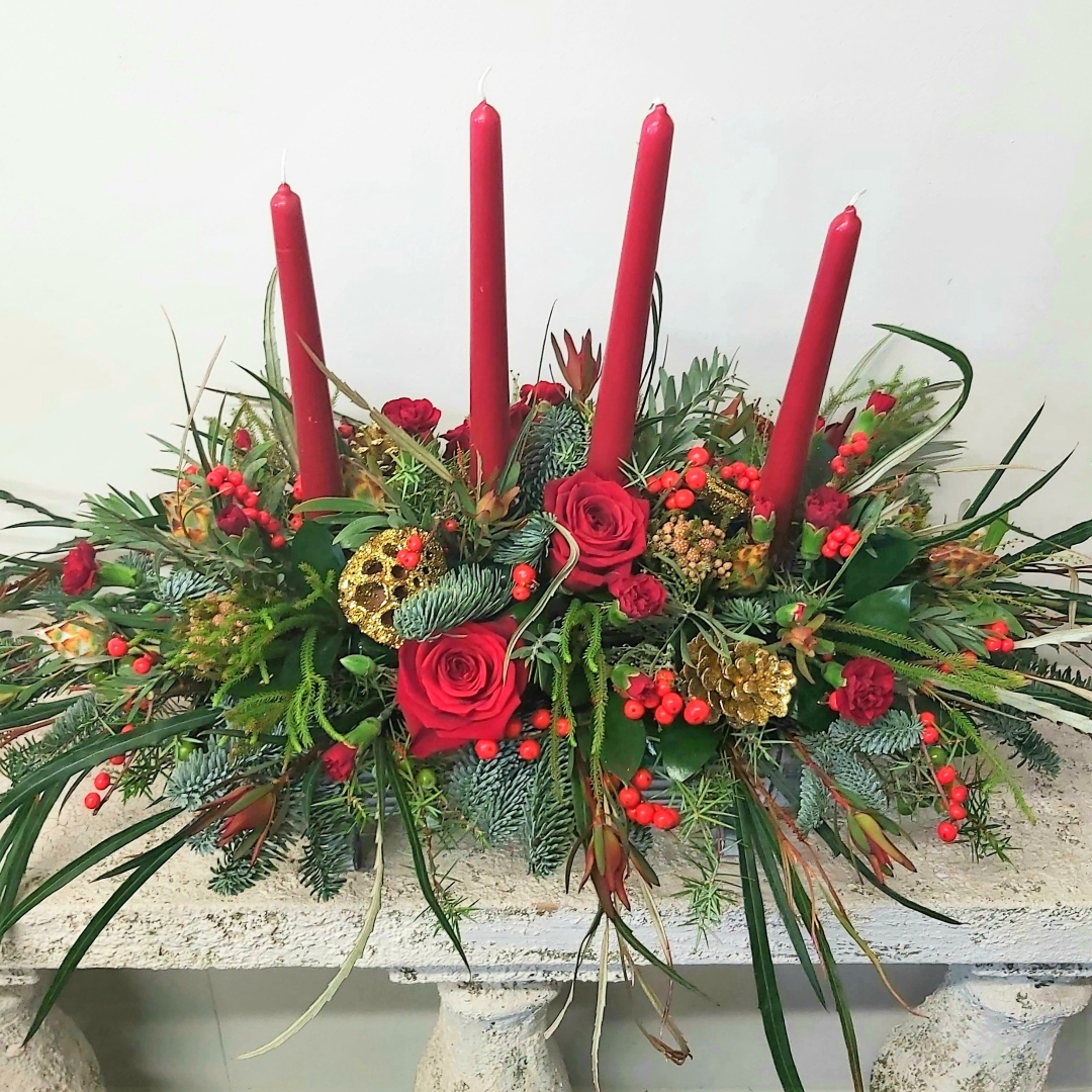 A Touch of Class is a luxury Christmas centrepiece designed to add elegance and seasonal colour to your home. This long-and-low arrangement features gorgeous red roses, red carnations, seasonal flowers, berries, gold cones, lush eucalyptus, and beautifully scented foliage for a rich, festive finish.